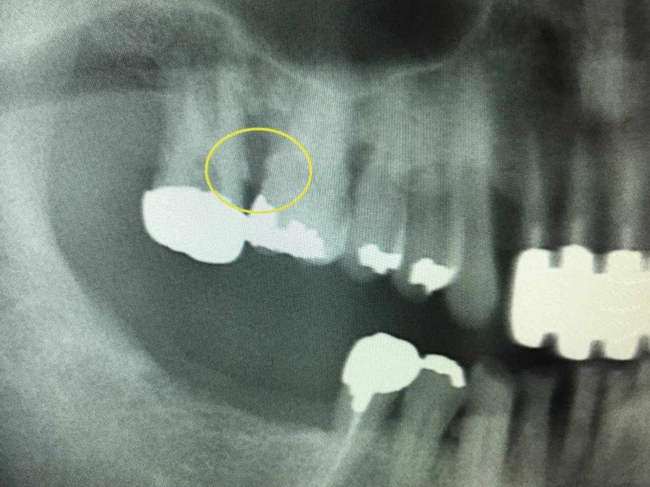 写真の黄色の円で囲まれている部分は歯石が付着し歯周病が進行している状態を示しています。