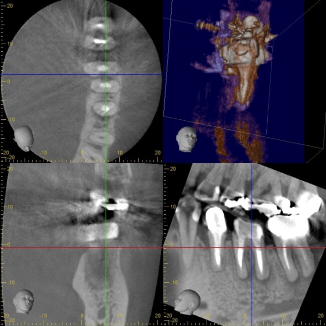 このような、厚い皮質骨(骨の表面の硬い部分)に取り囲まれた病変は、通常のデンタルX線では発見することが困難なこともありますが、歯科用3DCTだと、病変の有無、位置や大きさを把握することが可能になります。