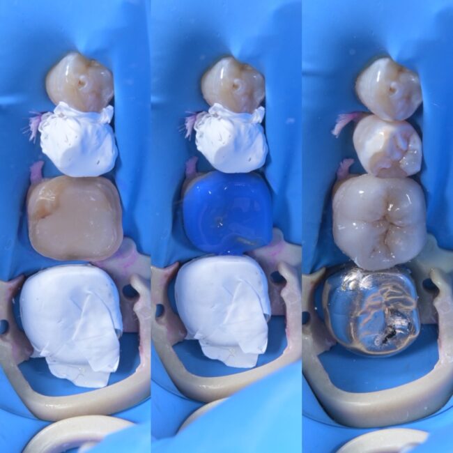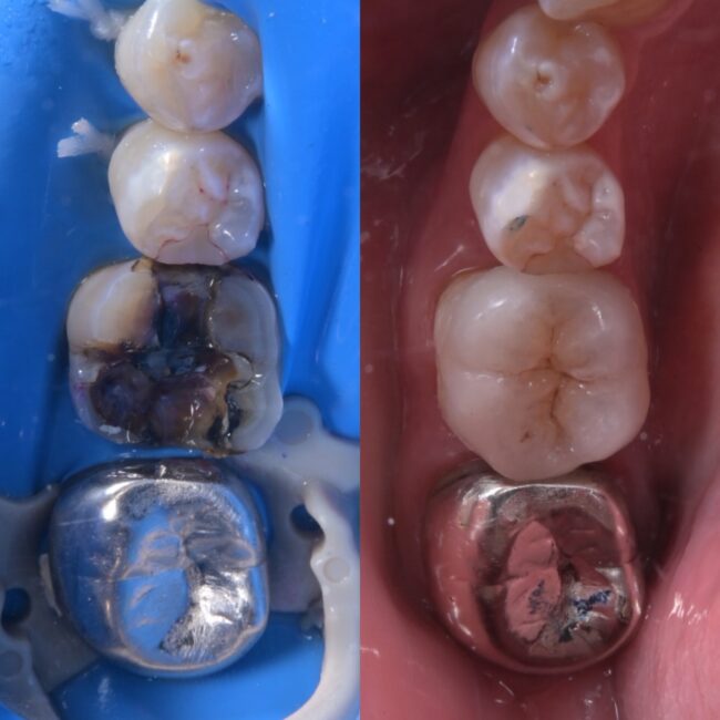 写真は奥から2番目の歯が欠けた銀歯の状態(左)銀歯を外した状態(中央)虫歯を除去した状態(右)になります。