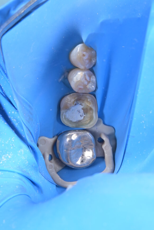 治療中に露髄(歯の神経に触っています)していますが、ラバーダムをすることで歯髄(歯の神経)を保存することができます。
